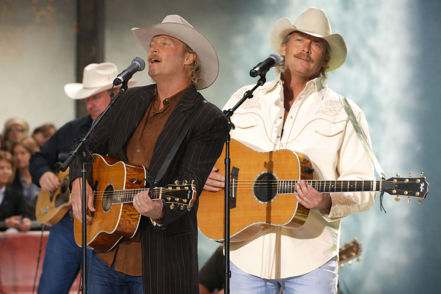 Alan Jackson has long been a defining voice in country music, known for his unmistakable style and unwavering commitment to tradition. In the image above, he appears on stage in a powerful live performance moment, dressed in a white cowboy hat and holding an acoustic guitar while singing into a microphone. Standing alongside another guitarist—likely part of his band—Jackson exudes calm confidence and musical authority. The setting feels intimate yet energetic, with a visible audience in the background and soft lighting that enhances the authenticity of the scene.