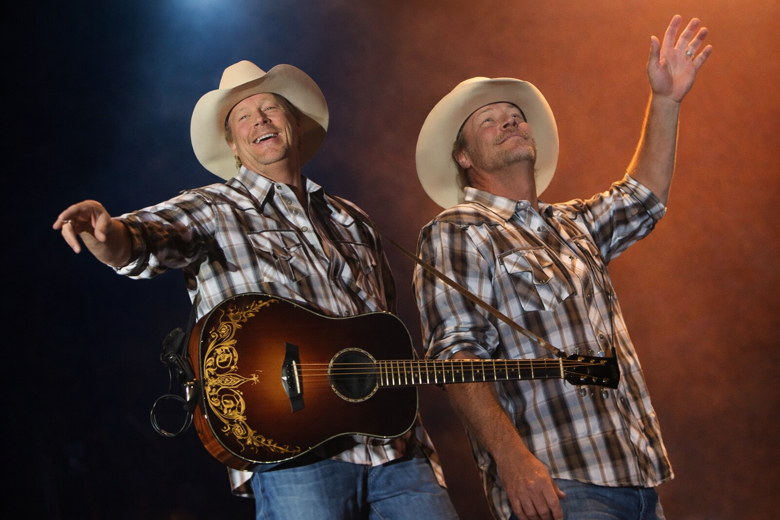Few artists in country music have managed to maintain both authenticity and widespread appeal across decades quite like Alan Jackson. In the image provided, Jackson appears on stage in a moment that feels both celebratory and deeply connected to his roots. Wearing a classic white cowboy hat and a plaid shirt, he stands with a guitar slung across his body, smiling and gesturing outward—fully engaged with the audience. The warm stage lighting, blending amber and blue tones, creates a vibrant yet intimate atmosphere that mirrors his musical style: traditional, heartfelt, and enduring.