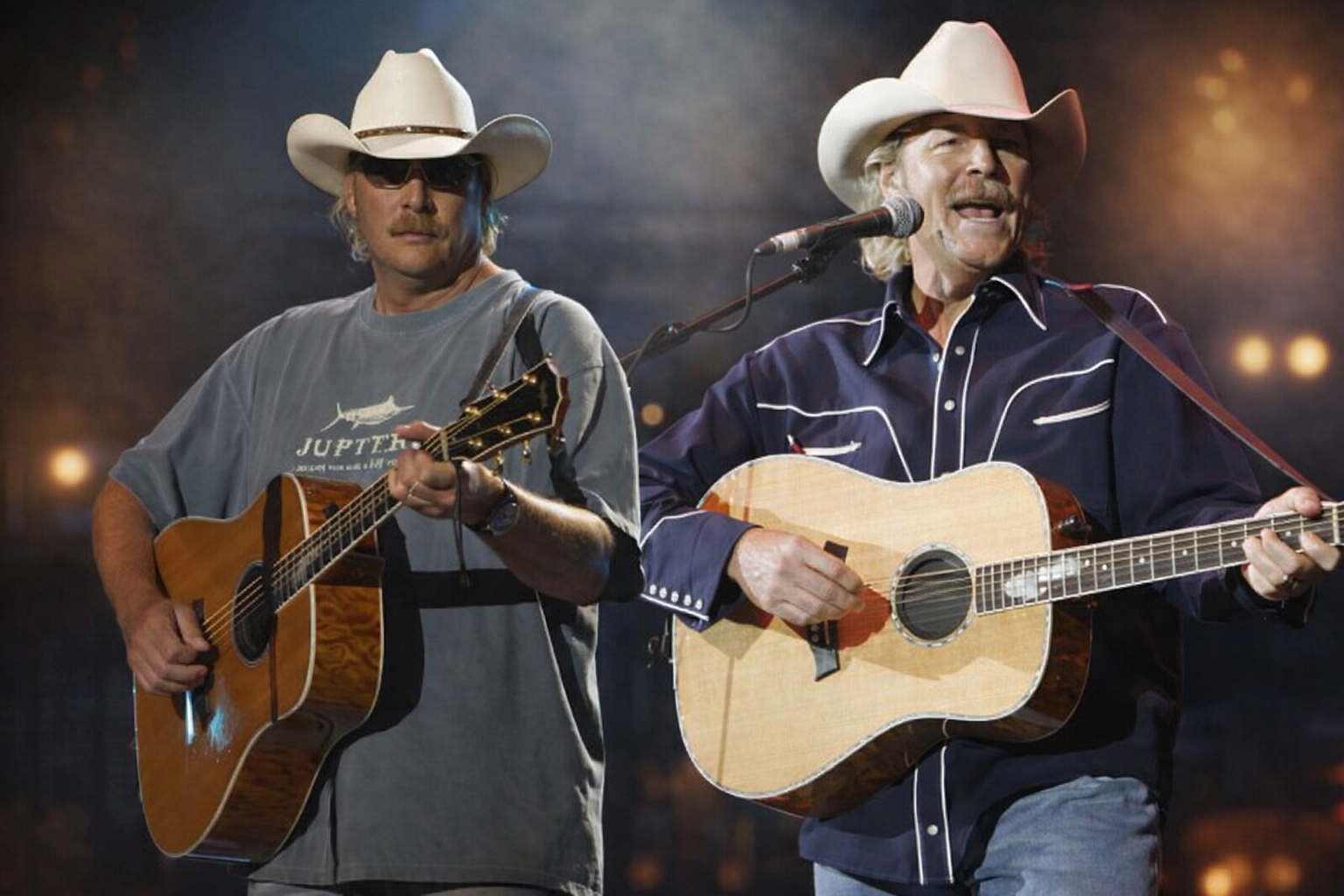 Alan Jackson has long stood as one of country music’s most authentic and respected voices, and the image above offers a deeply human and reflective glimpse into his life today. Unlike the high-energy stage performances often associated with his career, this scene is quiet, intimate, and meaningful. Wearing his signature white cowboy hat, Jackson appears alongside another moment of himself seated in a wheelchair—an artistic representation that speaks to both strength and vulnerability. The warm lighting and calm indoor setting create a contemplative atmosphere, reminding us that behind the legend is a man who has lived, endured, and inspired. This article explores Alan Jackson’s appearance, the symbolism of this image, and his lasting impact on country music.