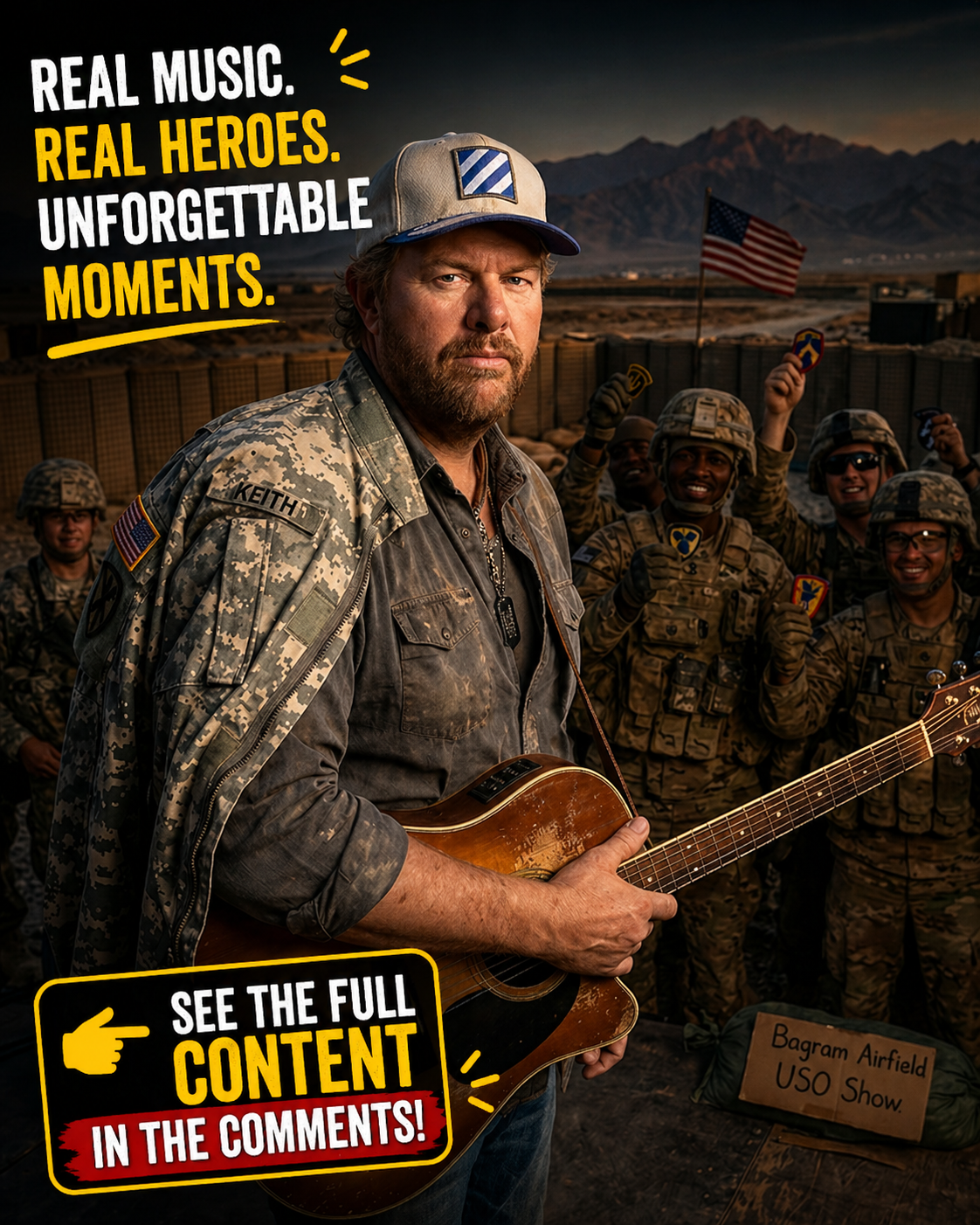 Toby Keith’s performances took him across multiple war zones, including Iraq, Afghanistan, Kuwait, and Kyrgyzstan. These were not traditional concert venues. Sometimes there was a stage. Sometimes there wasn’t. What remained constant was the audience—men and women in uniform, carrying the weight of long deployments and the distance from everything familiar.